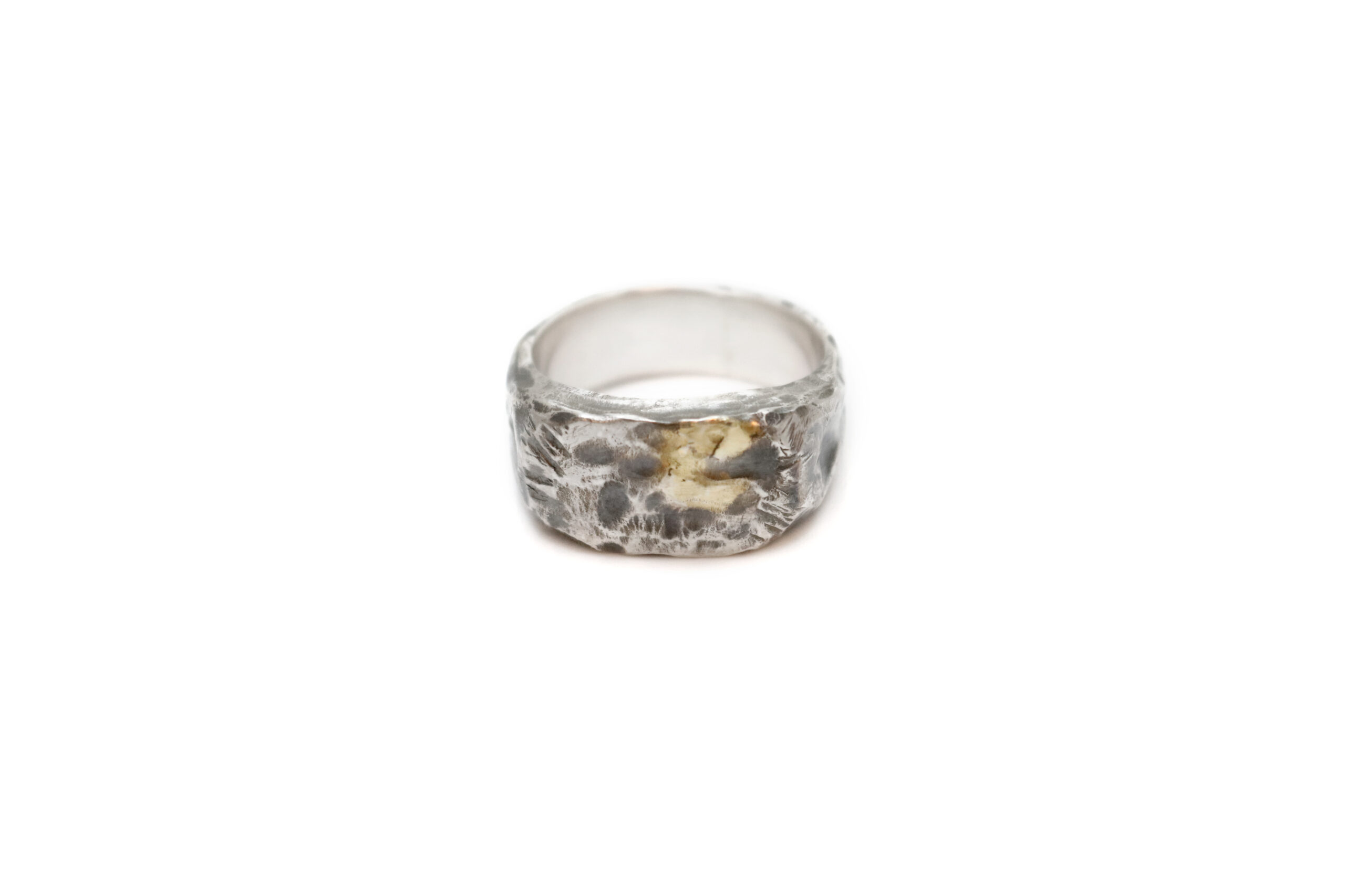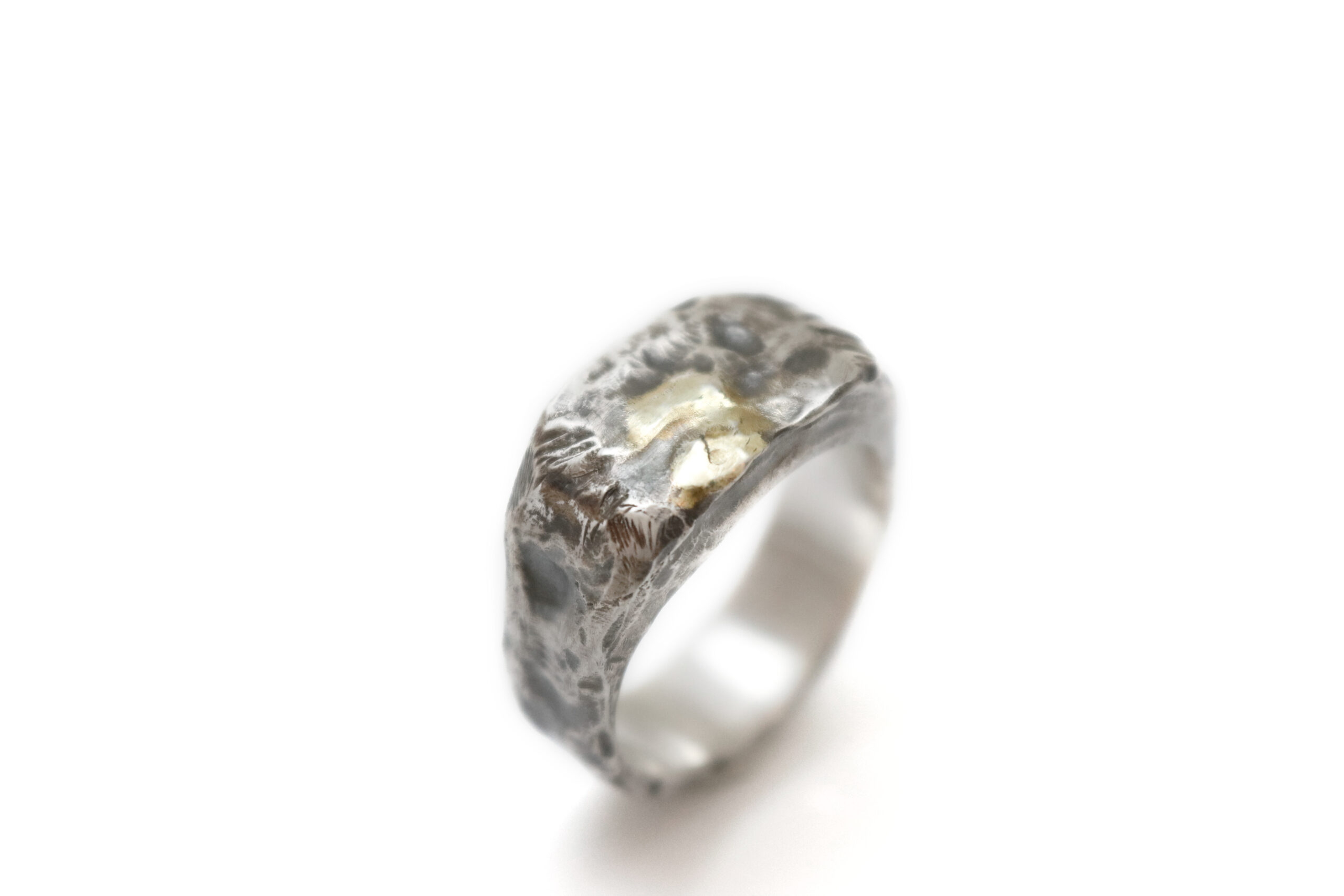 Den oxiderede overflade forstærker dybden i sølvet og fremhæver ringens struktur, så lyset fanges forskelligt alt efter, hvordan ringen bæres og bevæges. Det giver et levende udtryk, der hele tiden forandrer sig – præcis som naturen selv. Den lille 14 karat guldklump på toppen kan ses som et varmt modspil til det kolde, mørke sølv, inspireret af de overraskende kontraster i det arktiske landskab, hvor varme nuancer pludselig bryder det barske miljø.