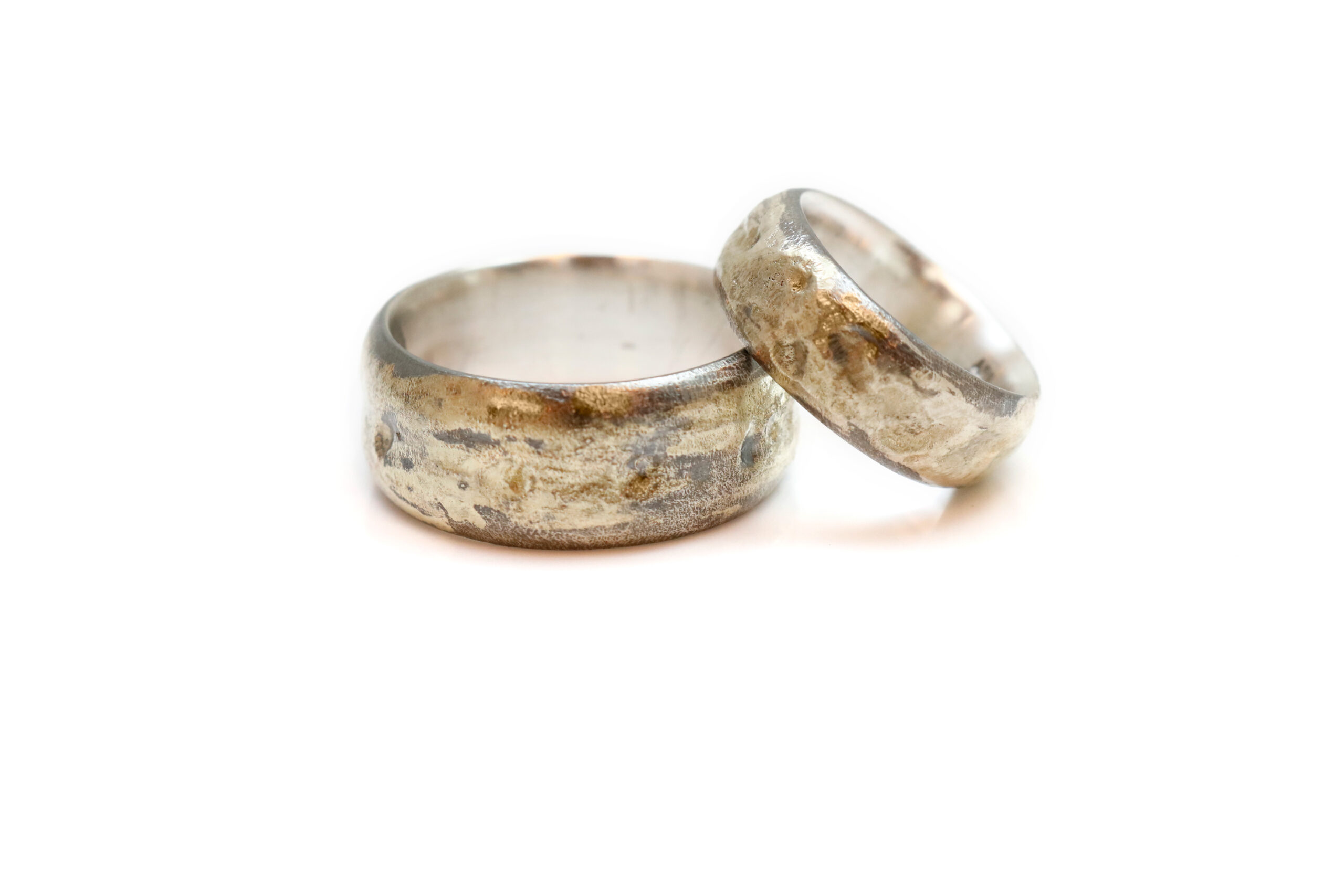 Sølvringen har fået sit rustikke udseende ved gentagne gange at blive opvarmet så sølvet og guldet flyder sammen og danner de dybe riller og sprækker. det er en spænende proces som virkelig kræver stor erfaring. Når du bestiller ringene vil dimensionerne være de samme, men fordi der er tale om metaller på omkring 1000 grader, vil rillerne se forskellige ud fra ring til ring. Det er det, der gør ringen unik og håndlavet af en guldsmed.